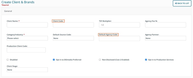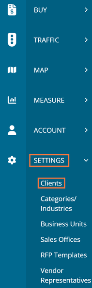 To add a Client Code and Agency Code, click Settings then Clients on the left-hand side menu.