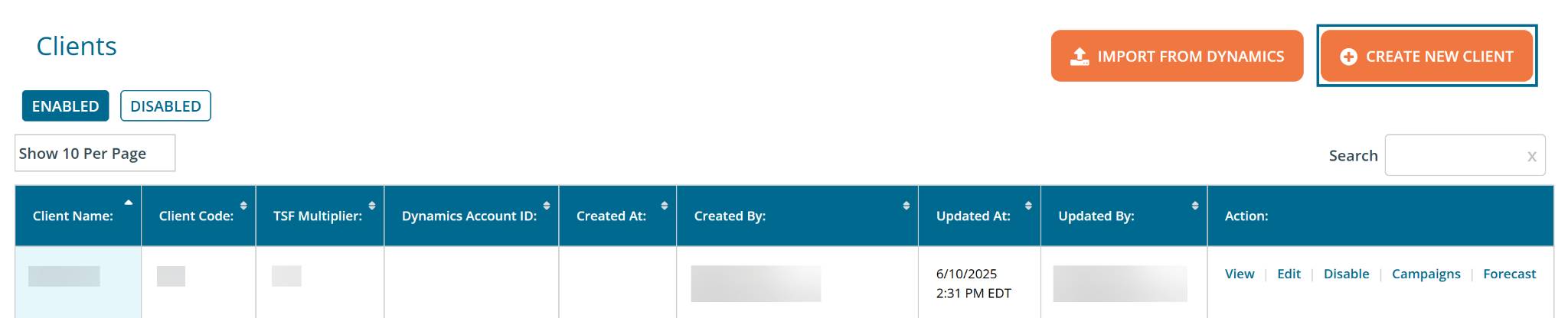 You will now see all Clients listed in your dashboard. Click Create New Client.