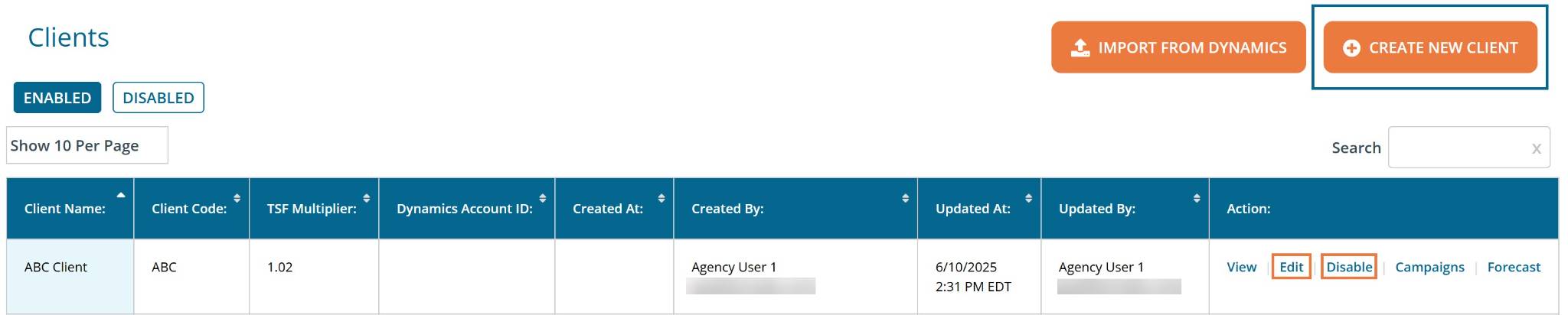 On the Edit Client & Brands page, you have the ability to add new and edit existing brand names along with brand codes. In addition, individual brand names and related brand codes can be disabled if they are no longer active.