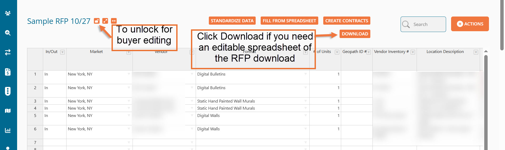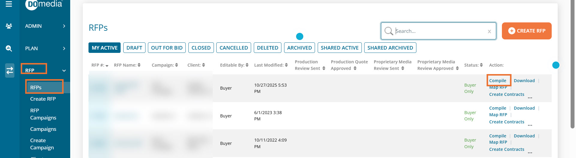 To do so, you can navigate to your RFP Dashboard (Click RFPs under the RFP menu) and either click on Compile under the Actions column to access the grid with all vendor proposals or on the RFP Name to pull up an individual vendor's proposal grid.