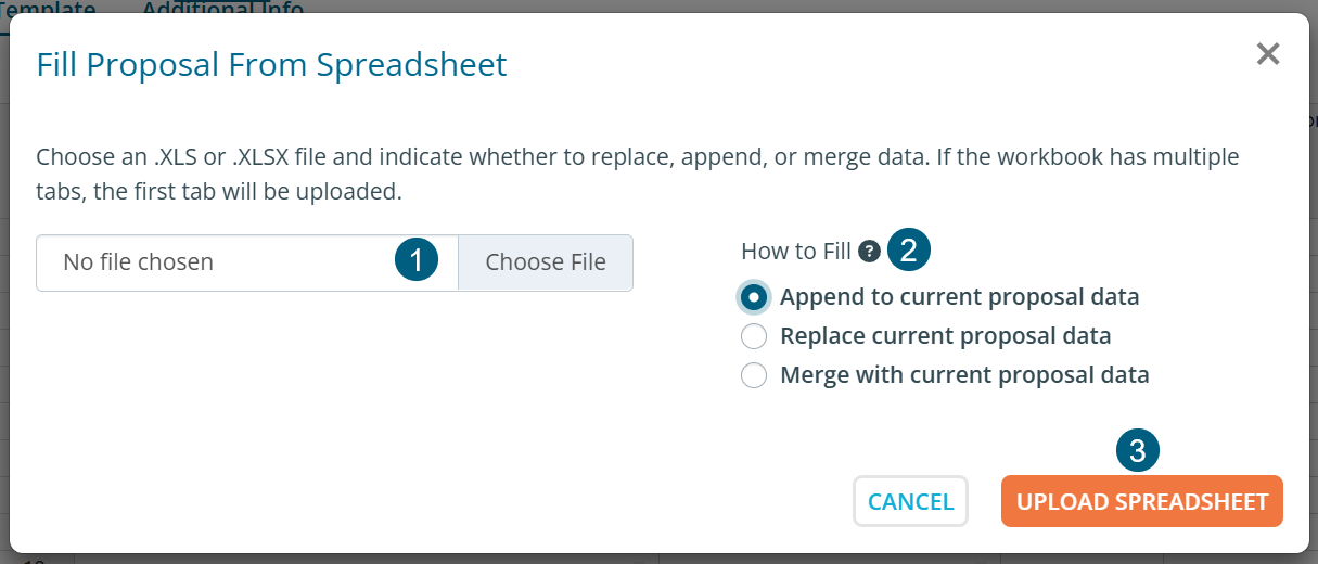 Choose the file from your computer and indicate whether to replace (overrides current data) or append your data (adds this data to the bottom of the existing data) to the current proposal data.