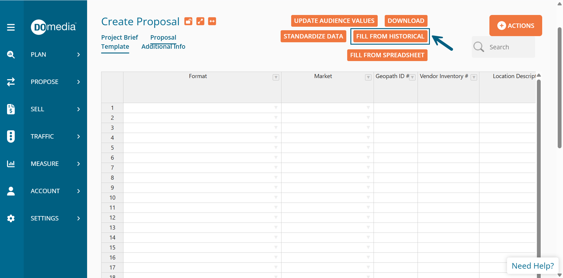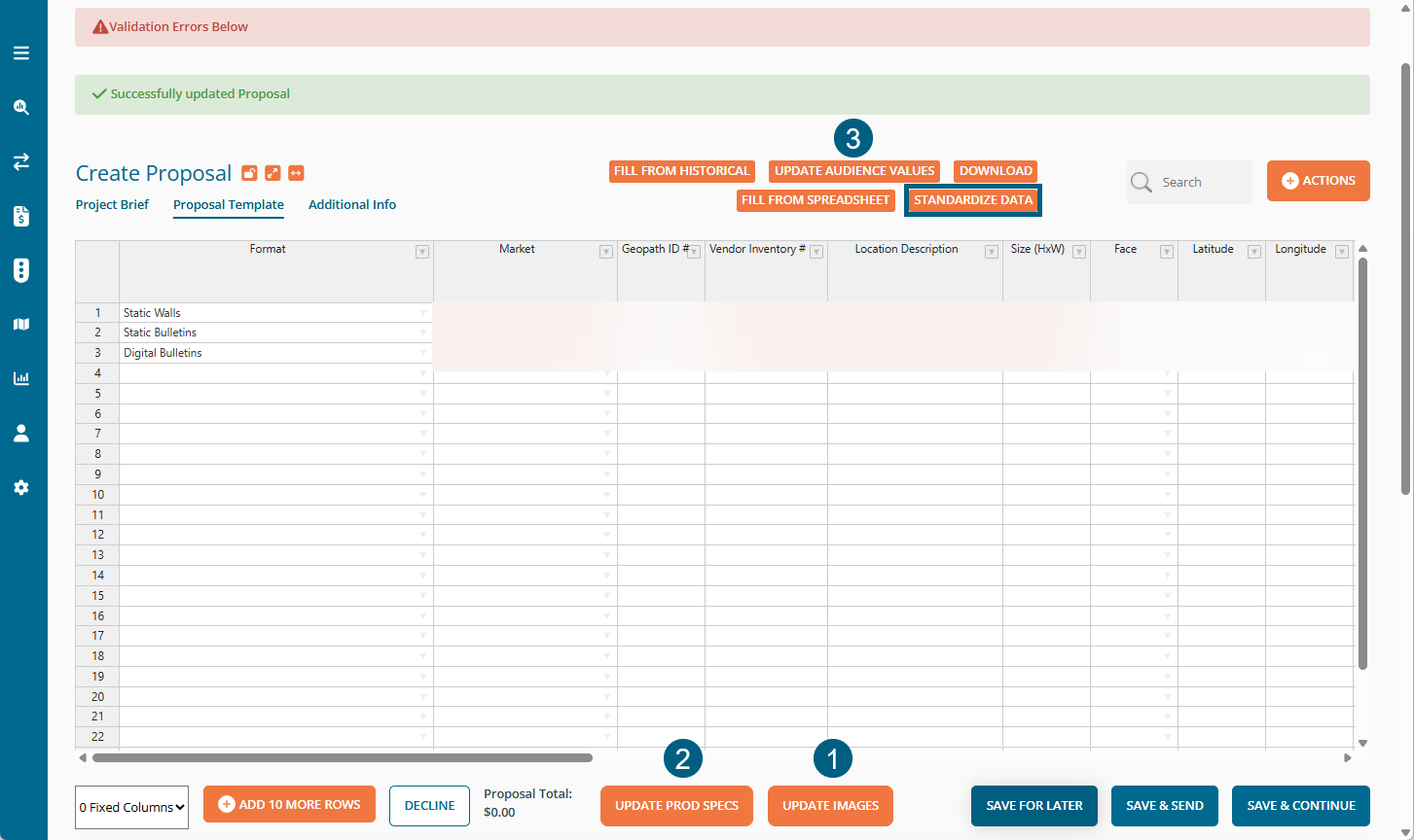 After your proposal data is clean and looks good you can proceed to uploading images, prod specs, and Geopath data (if applicable). See the below support articles for more detailed help with these, although the buttons can be seen above and below the grid.