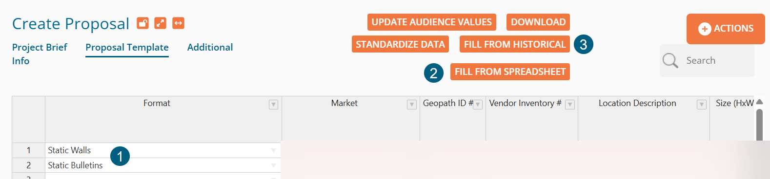 Simply manually enter the information you wish to include in the grid. You can begin by typing values into the first row - this represents your first location or media offering in your proposal. You can enter values directly into the grid or cut and paste them from another spreadsheet.