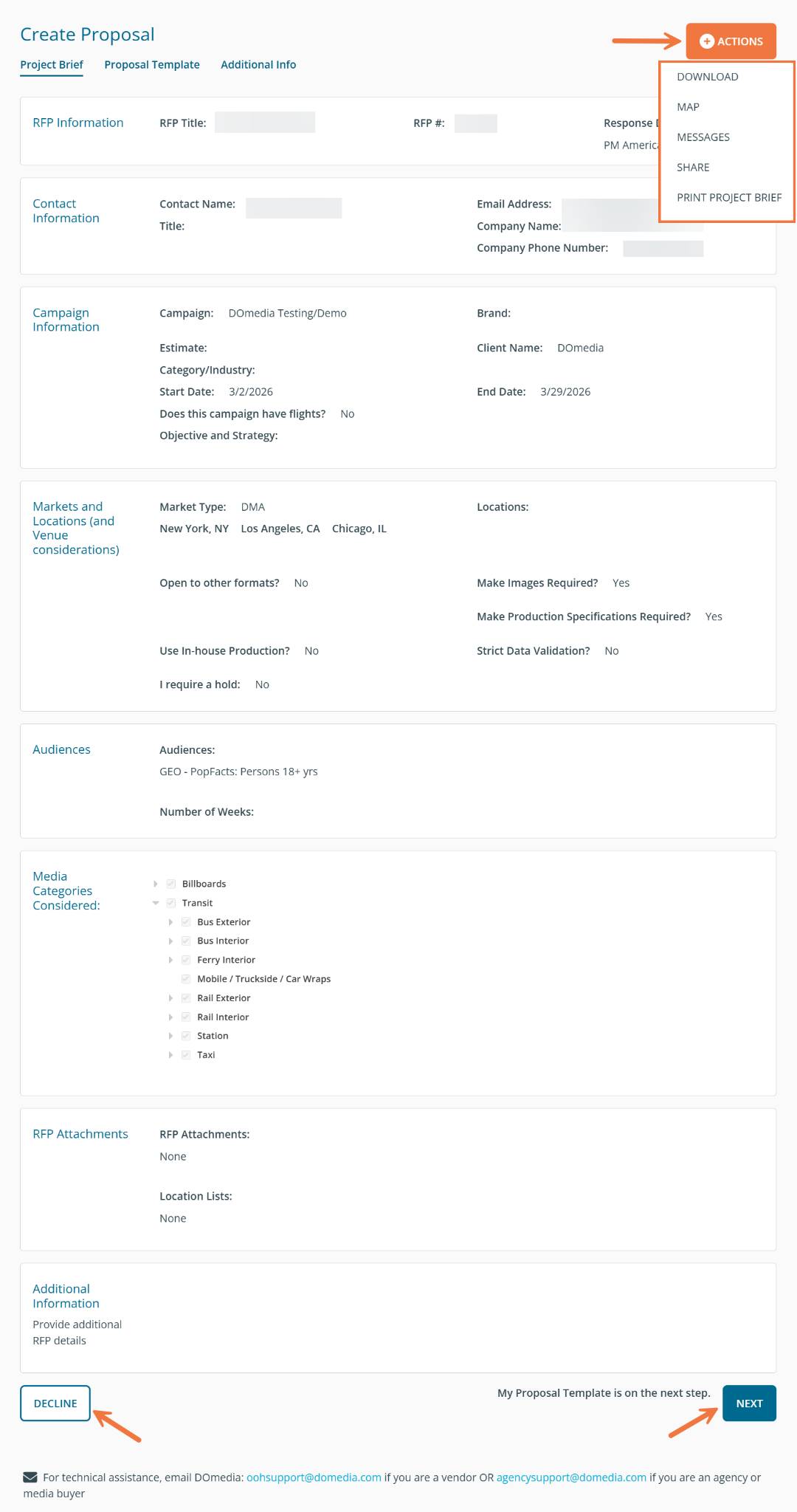 Here you will find campaign level details outlined by the buyer. The Project Brief screen will show you the contact information for the agency representative, Campaign Information, the desired Markets and Locations, any Audience Demographics that requested, and also lists attachments and any Additional Information.