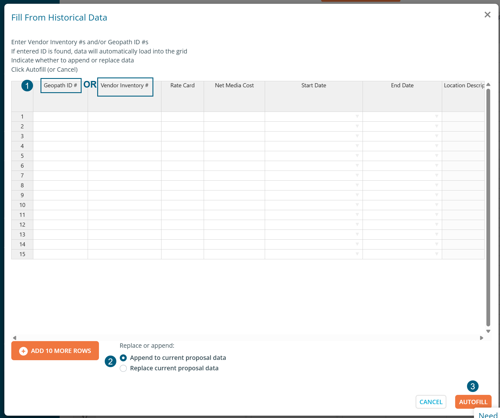 Indicate whether to replace (overrides current data) or append your data (adds this data to the bottom of the existing data) to the current proposal data before clicking 'Autofill'. Note you can also add these additional fields later from the grid.
