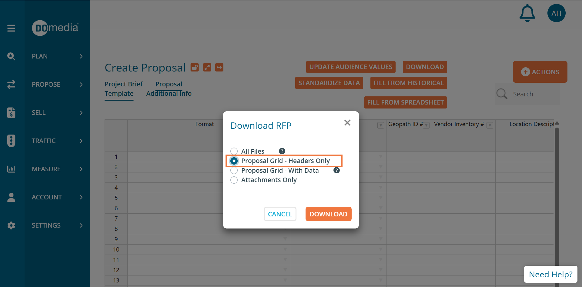 To start this process it is best to download just the headers for the specific RFP you are working on. Click on the Download button and then select Proposal Grid - Headers Only to do so.