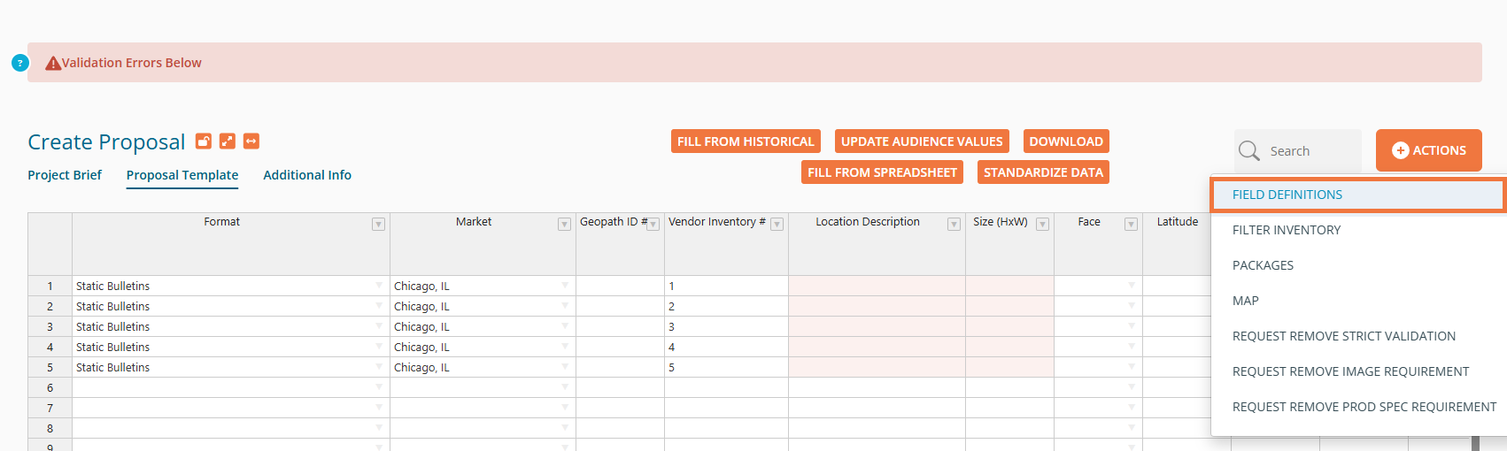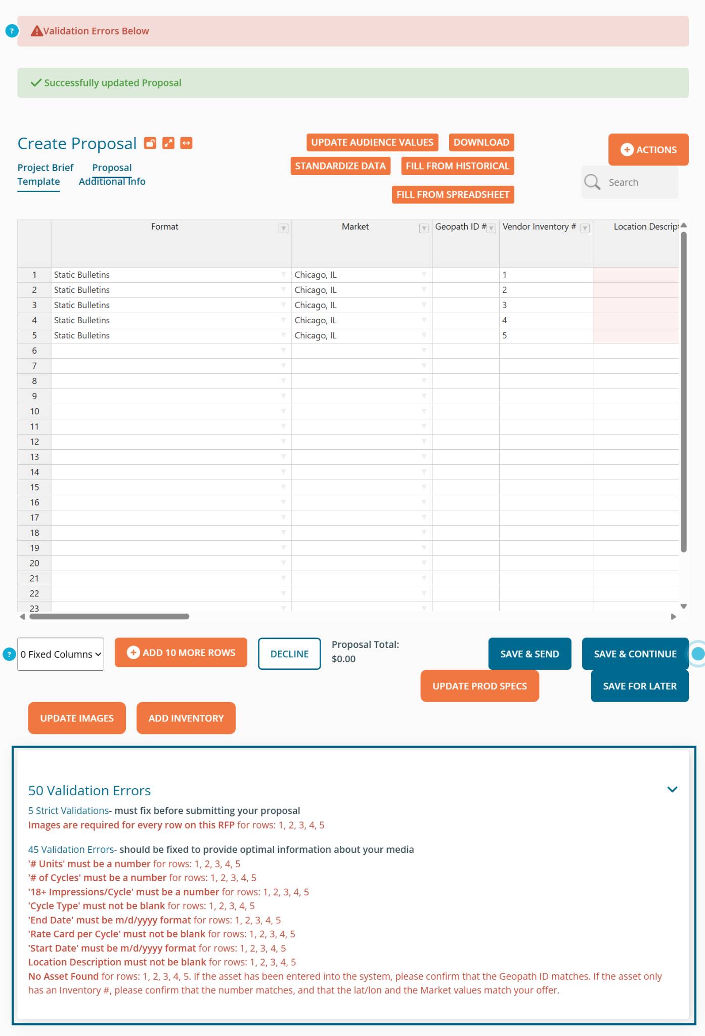 Having standardized data helps create a faster workflow for both buyers and sellers alike. Key columns must match the system requirements in order for agencies to easily generate contracts based on the proposal. Similarly, entering accurate inventory data in a proposal will allow you to easily pull it again in the future for those units using our Fill From Historical tool.