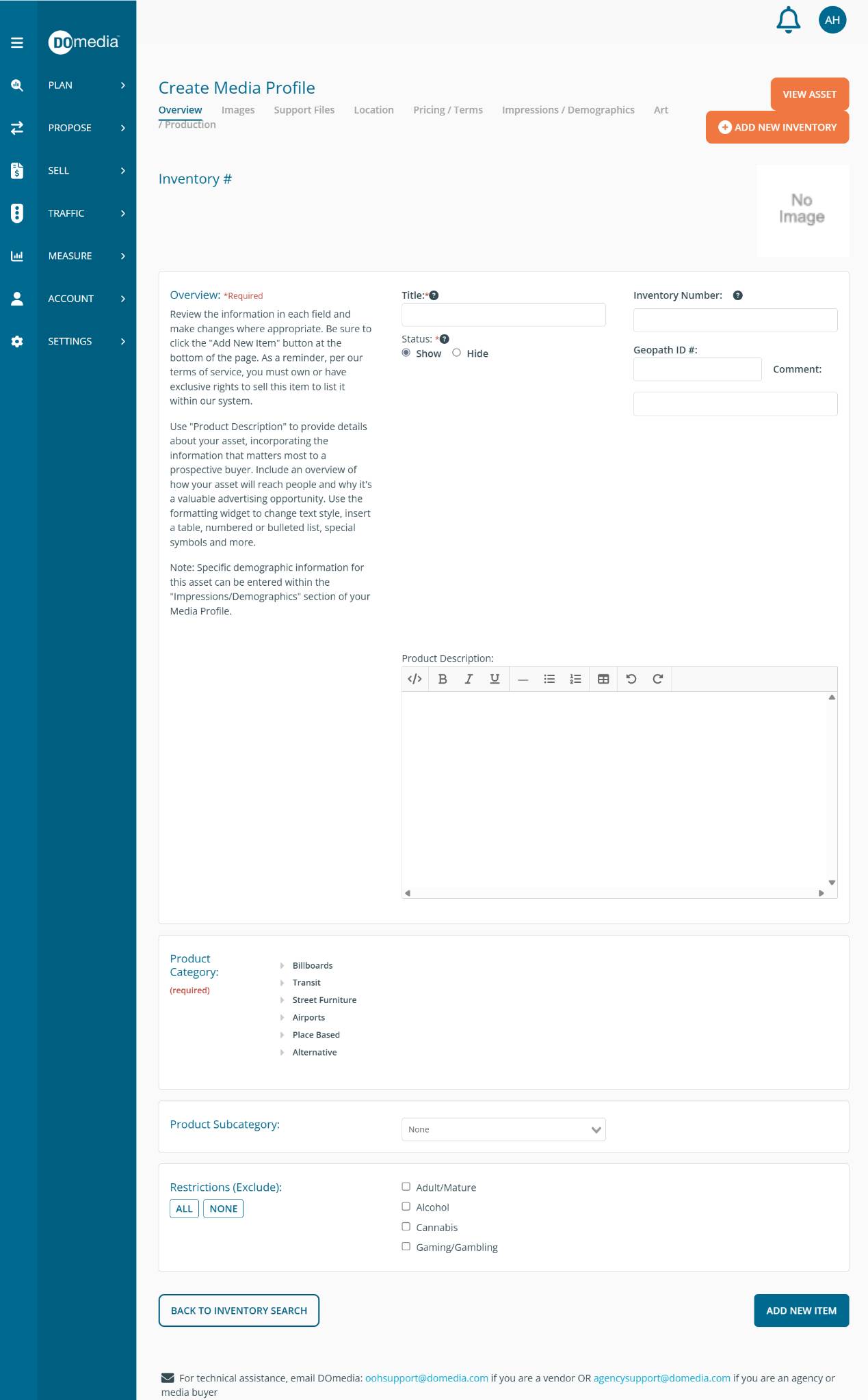 Once this information is completed and saved by clicking 'Add New Item', you have successfully created an asset. DOmedia encourages you to enter as much detailed information as possible. This will allow advertisers and agencies to consider the opportunity with complete information.