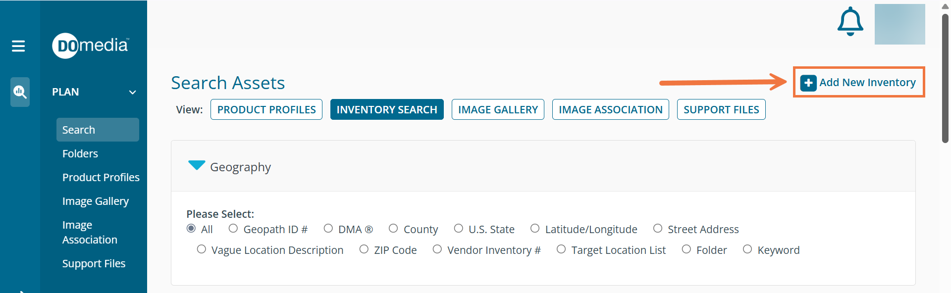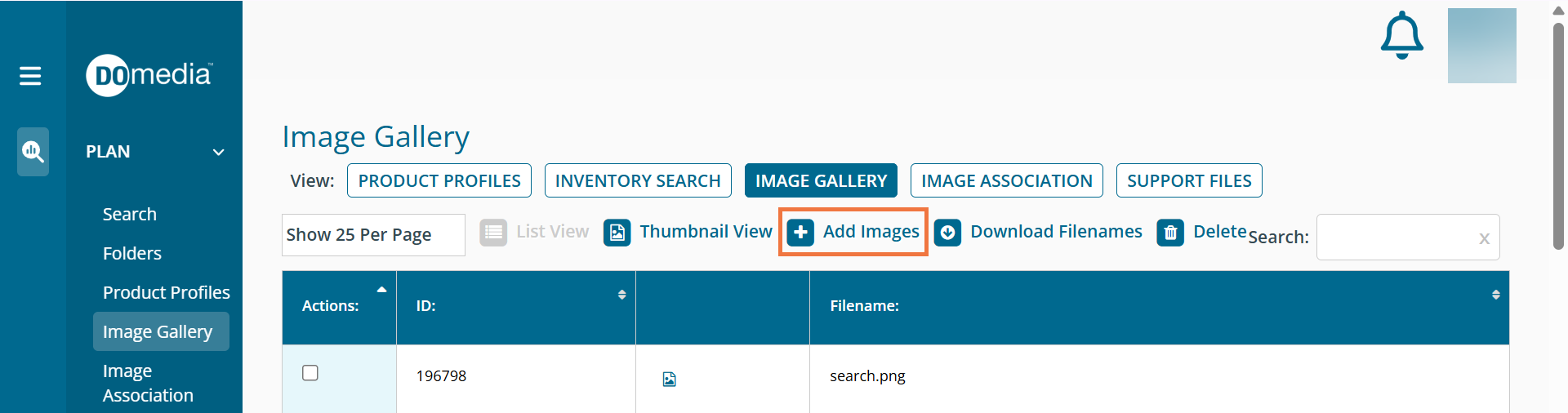 You can easily upload images into DOmedia that can later be associated with your inventory. To do so, navigate to the Image Gallery, accessed under the Plan in the menu tab on the left.