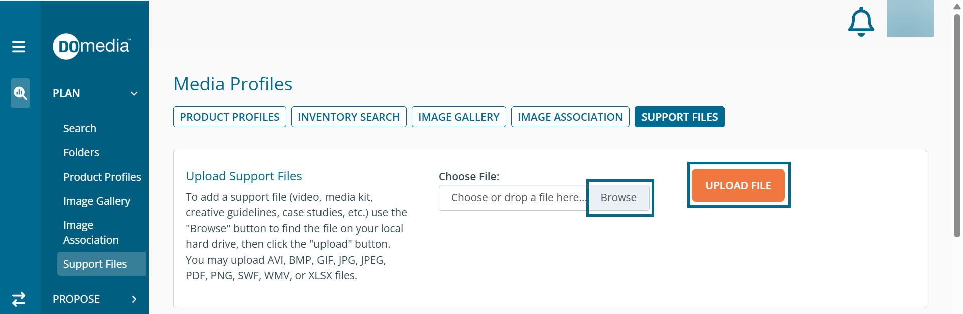 From the Support Files tab, you can associate support files, such as videos, media kits, creative guidelines, etc., with the newly created asset. To do so, first, you will need to upload the support files by clicking Plan and then clicking 'Support Files'.