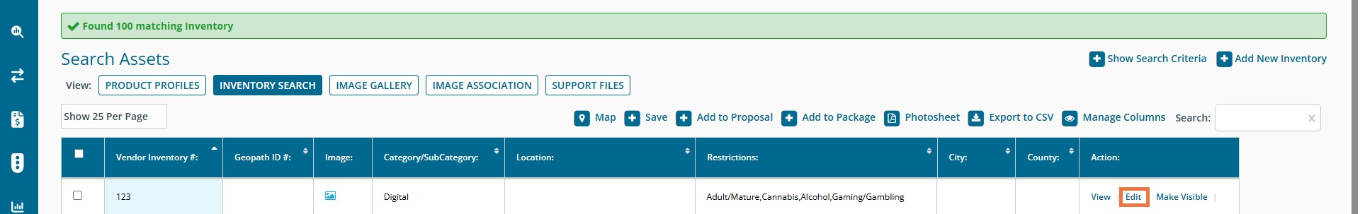 Now that your support files are in the system, you can associate them to the related assets. To do so, navigate back to your inventory by clicking 'Inventory Search'. Find your inventory again that you want to update and click 'Edit'.