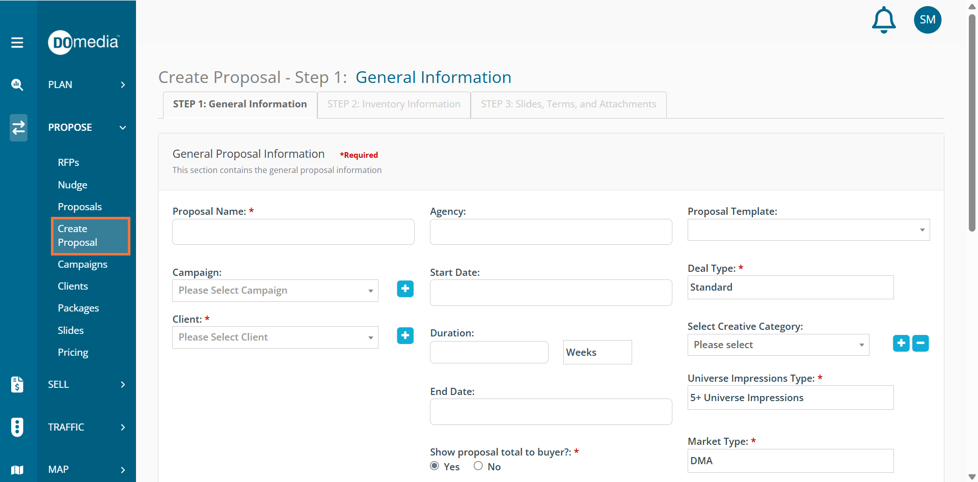 On the Create Proposal - Step 1: General Information page, you will want to select your 'Audience Demographic', 'Number of Weeks', and 'Second Number of Weeks' as desired.