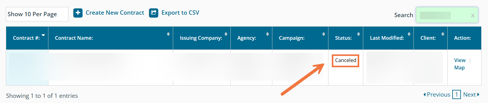 Cancel the Entire Contract All line items with cycle start and end dates beyond the current date will be removed from the contract. All contracted line items with cycle start and end dates prior to the current date will remain in the contract. The Contract status will change to Canceled.