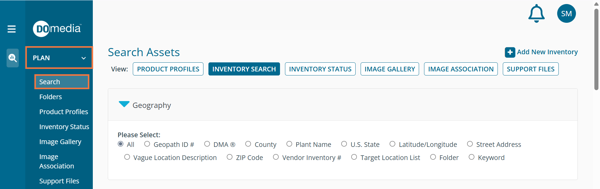 To create a proposal from an inventory search, hover over the 'Plan' menu in the white navigation bar across the top of DOmedia's homepage, and click 'Search' in the drop-down menu.