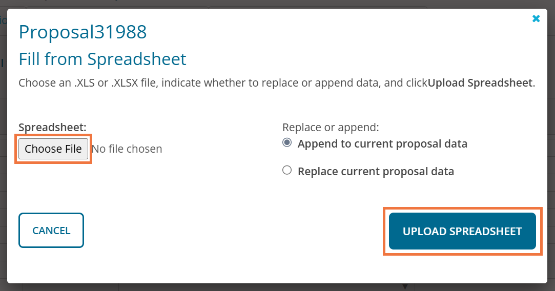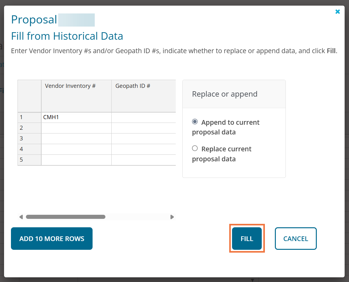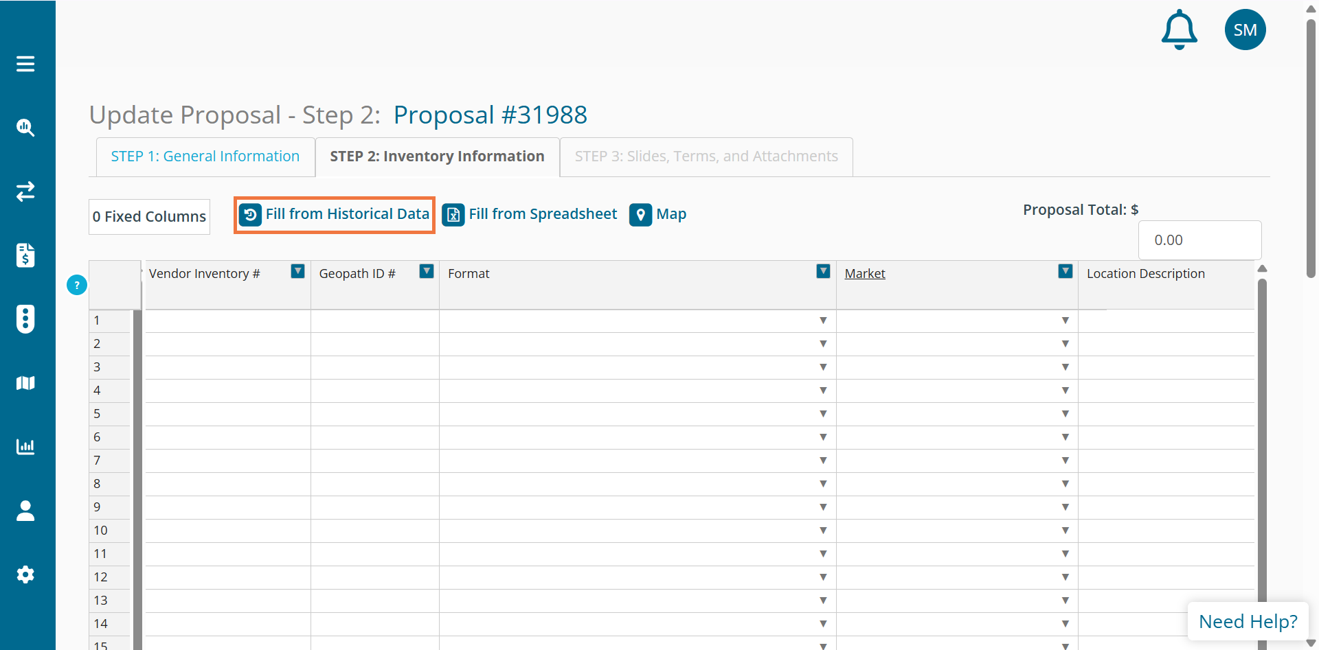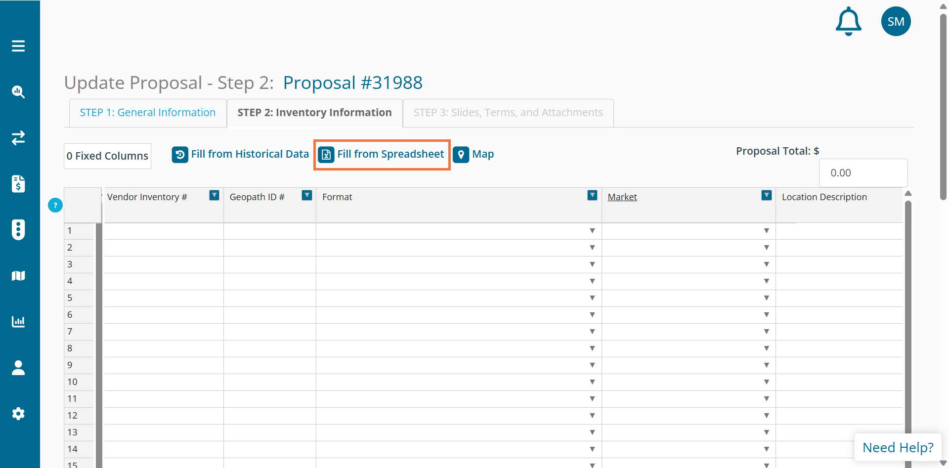 Step 2 displays the grid that can be filled with the inventory you want to be included in the proposal. Also, you can create your proposal by typing directly or copying and pasting into the grid, using either