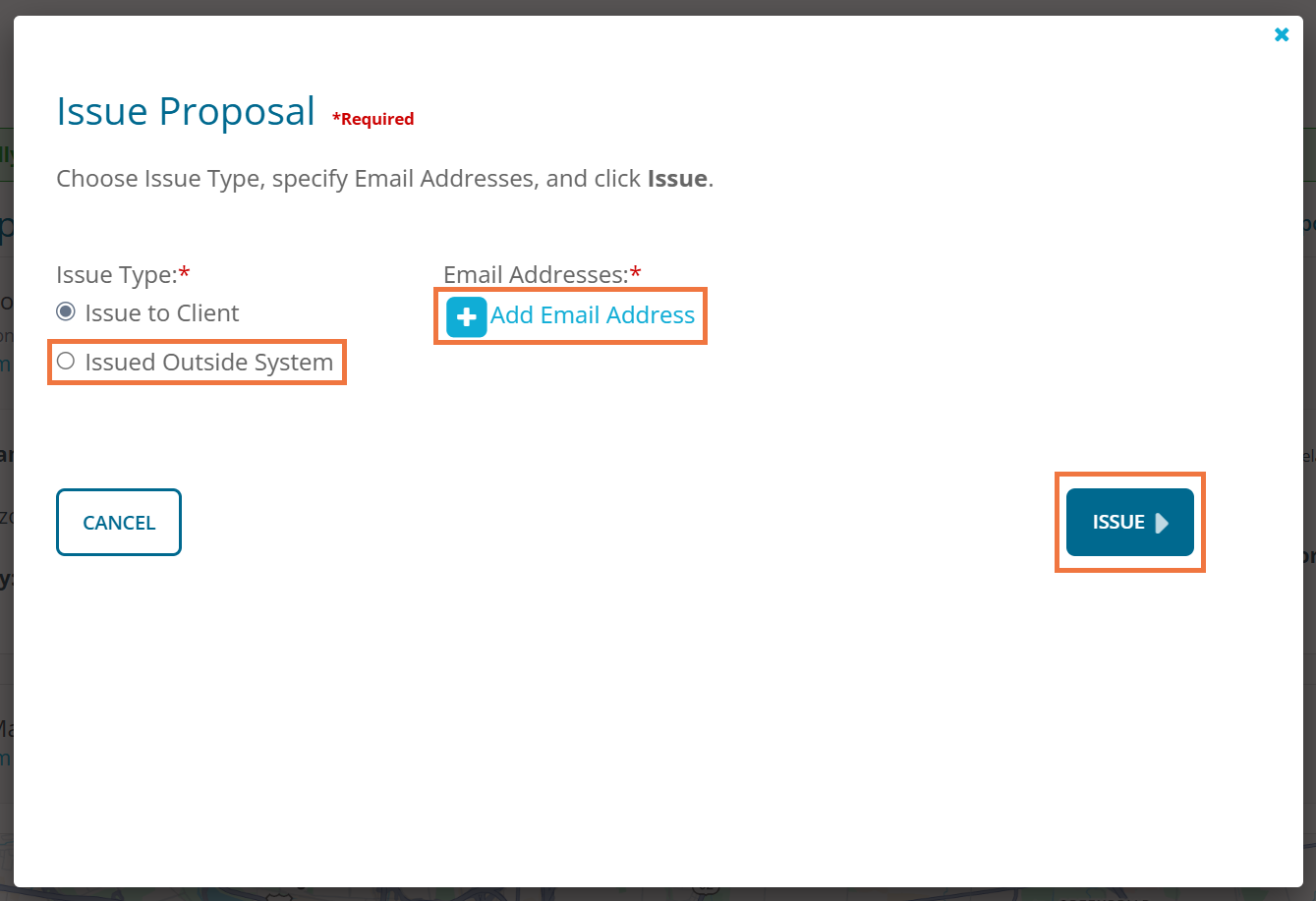 Enter your client's email and click 'Issue' to issue your proposal. (Multiple emails can be added by clicking the blue plus icon under the 'Email Addresses' field)