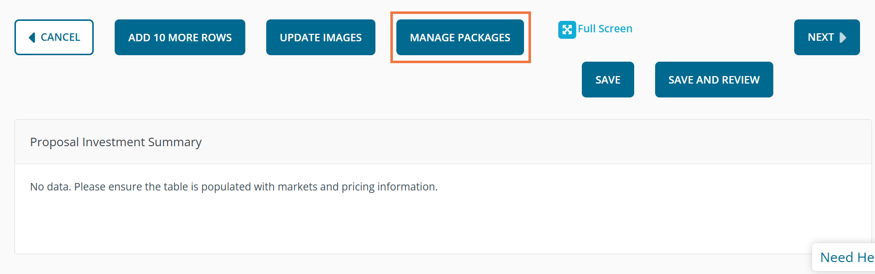 Proposal Package: A proposal package is two or more pieces of saved inventory and can be added to proposals by selecting the specific package located in the menu below. A proposal package must be created ahead of time to be added to a proposal. (Click here to learn how to to create a proposal package.) Note: The Package management button will not appear below the GRP Grid.