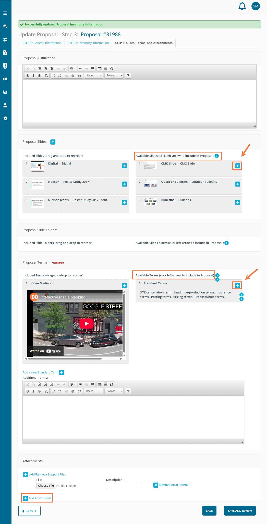 Create Proposal - Step 3: Slides, Terms, and Attachments