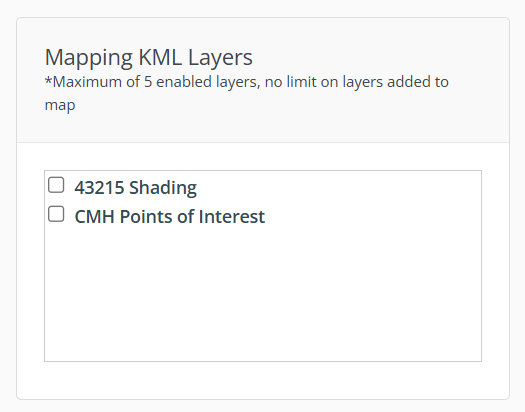 Mapping KML Layers: If you would like to include a KML Layer in your proposal, select one or more of your KML Layers. Note: A KML Layer must already exist to be available.