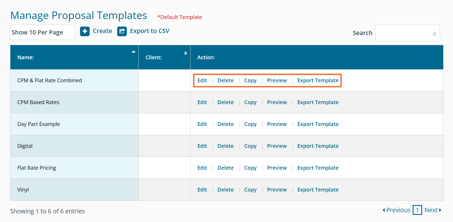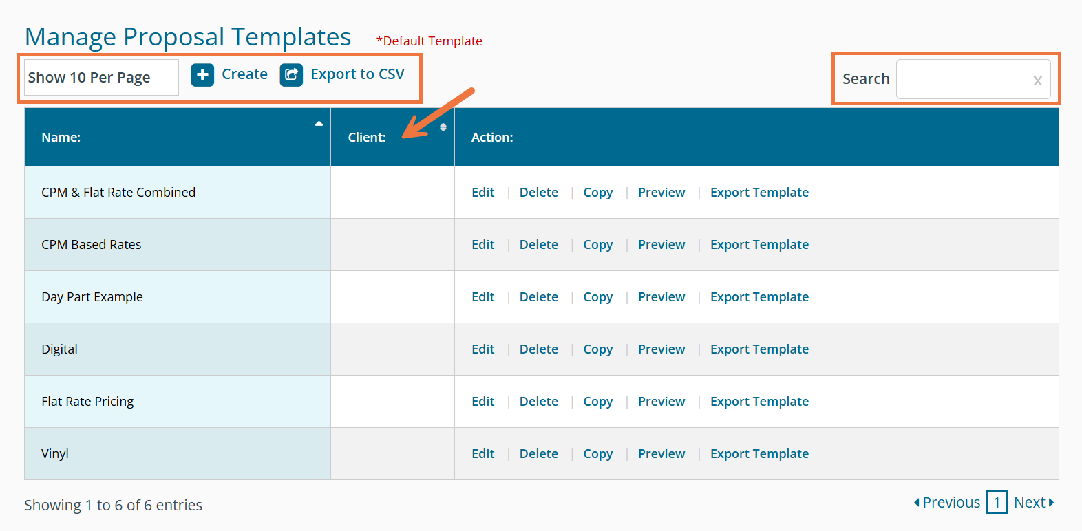 Show Per Page - You have the ability to increase or decrease the number of templates that are displayed on one page by using the entries drop-down menu. You have the options to display 10, 25, 50, or 100 templates that have been created. Create - This allows you to create a new template. Export to CSV - Clicking this allows you to export a list of all existing templates, along with the names of the clients that each template is associated with. Search - Easily navigate through a long list of templates by entering a keyword, client name, etc. into the search box. Sort - Click on the column headers 'Name' or 'Client' to sort them in ascending or descending order to quickly find the template you are looking for.