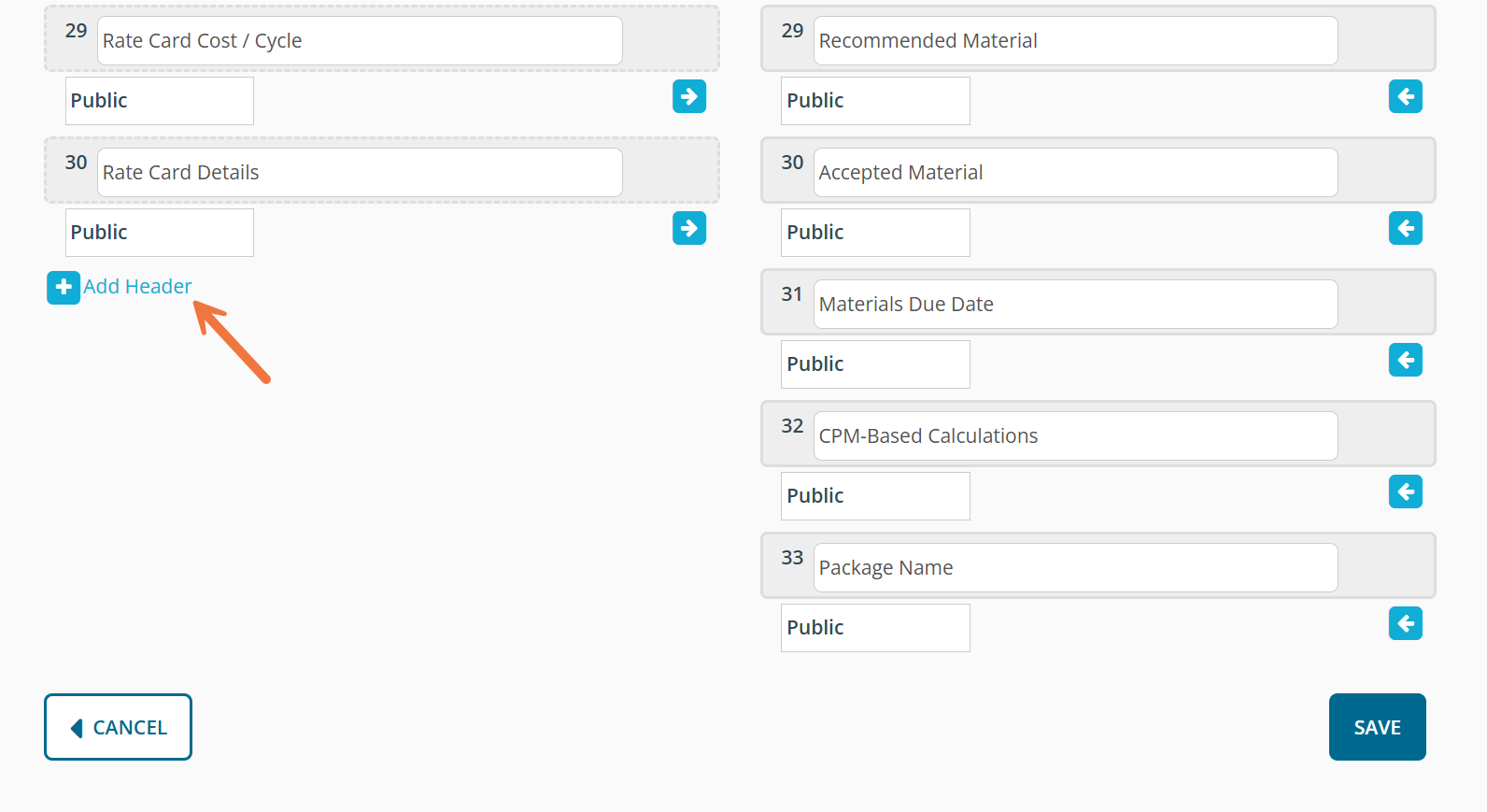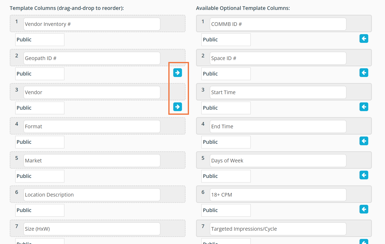 Template Columns - Choose which of the standard column headers you'd like to include for the proposal and what order you would like them displayed. Available Optional Template Columns - Add columns from a list of additional standard column headers that are not included in the standard DOmedia template. Available actions include: To add and remove columns use the arrow icons shown next to the headers. The column headers shown on the left side of the page are those that will be included in your template. Those listed on the right side are available to be added to your proposal template. To reorder the columns, simply drag and drop them to achieve your desired order. Note: Some of the standard column headers cannot be removed from the template. These will not have an arrow icon next to them.