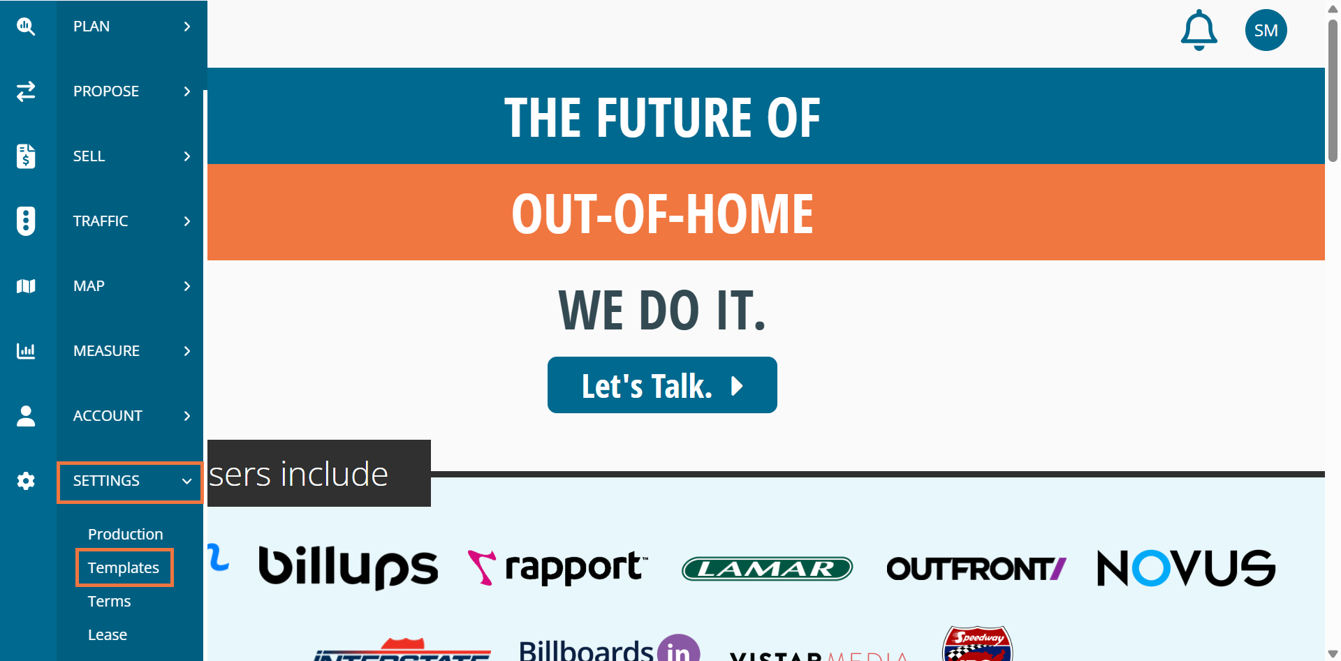 To access Proposal Template Management, visit DOmedia's homepage, hover over 'Settings' in the white navigation bar at the top of the screen and click 'Templates' in the drop-down menu.