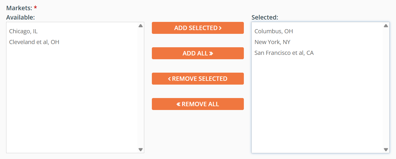 Note: Only products designated as 'Can be Sold via GRP' will show in the lists. The products listed will also change based on the markets selected.
