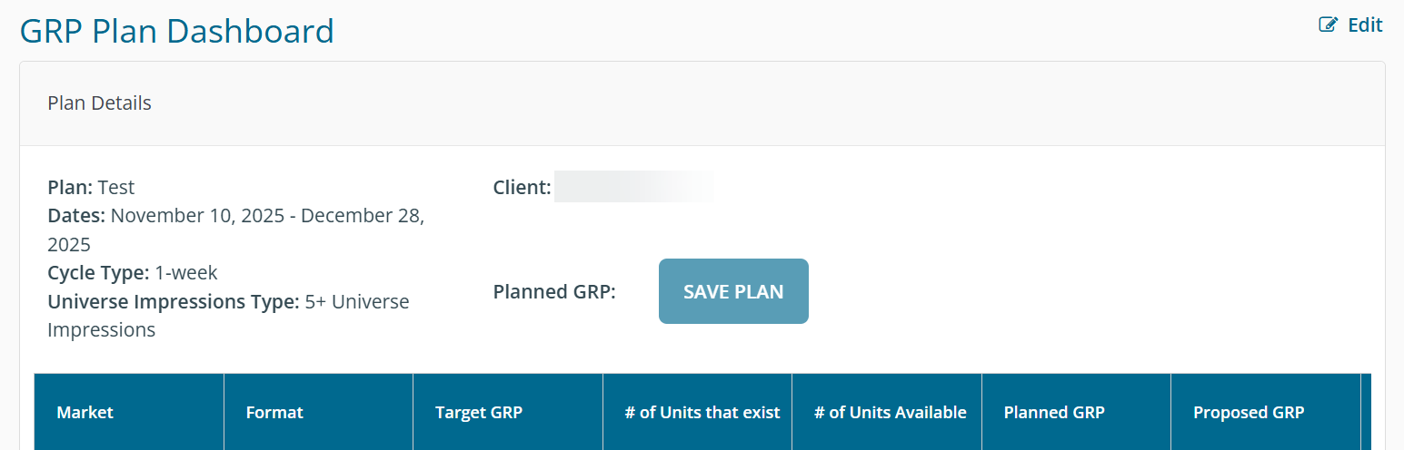 The newly created GRP Plan will now show you how many GRPs could be planned in the market as well as how many GRPs are available.