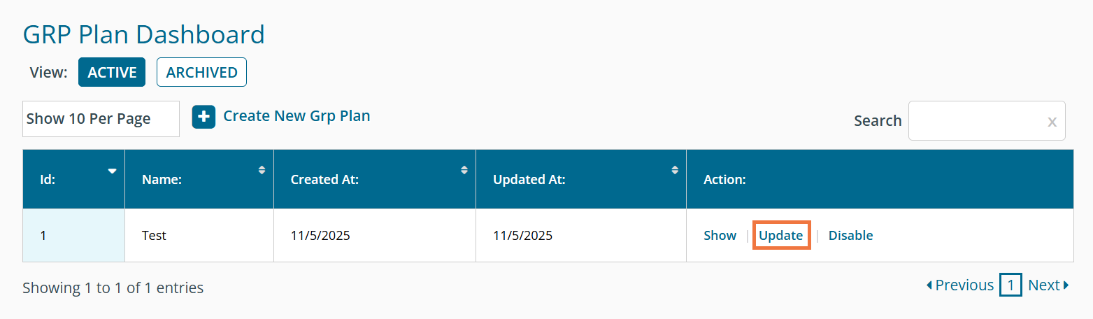 Update: To Update a GRP Plan, click 'Update' within the GRP Plan Dashboard.