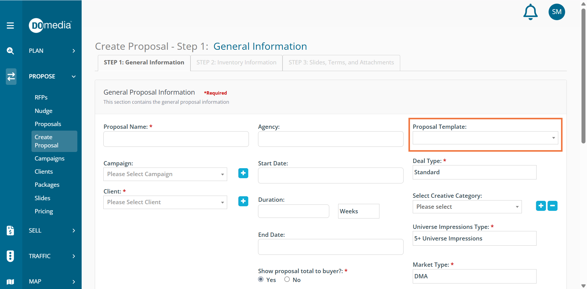 On Step One: General Information, Your default template will be shown under Proposal Template in the drop down.
