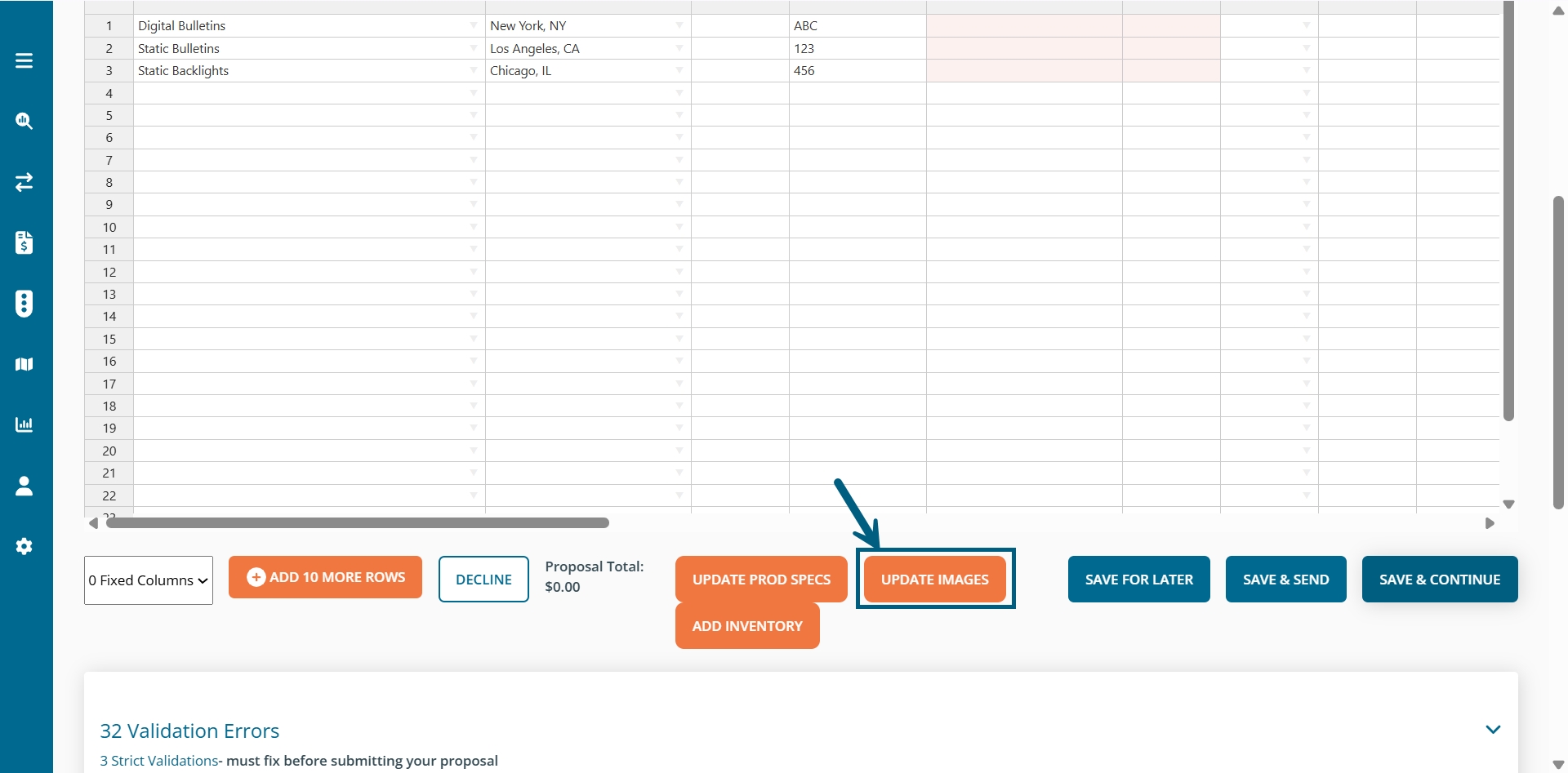 You have the ability to add photos of your inventory directly from your proposal. You'll know if a unit in your proposal doesn't already have an image associated with it from the "Validation Errors Below" at the top of the screen. To add an image for that unit, you can click the "Update Images" button at the bottom.