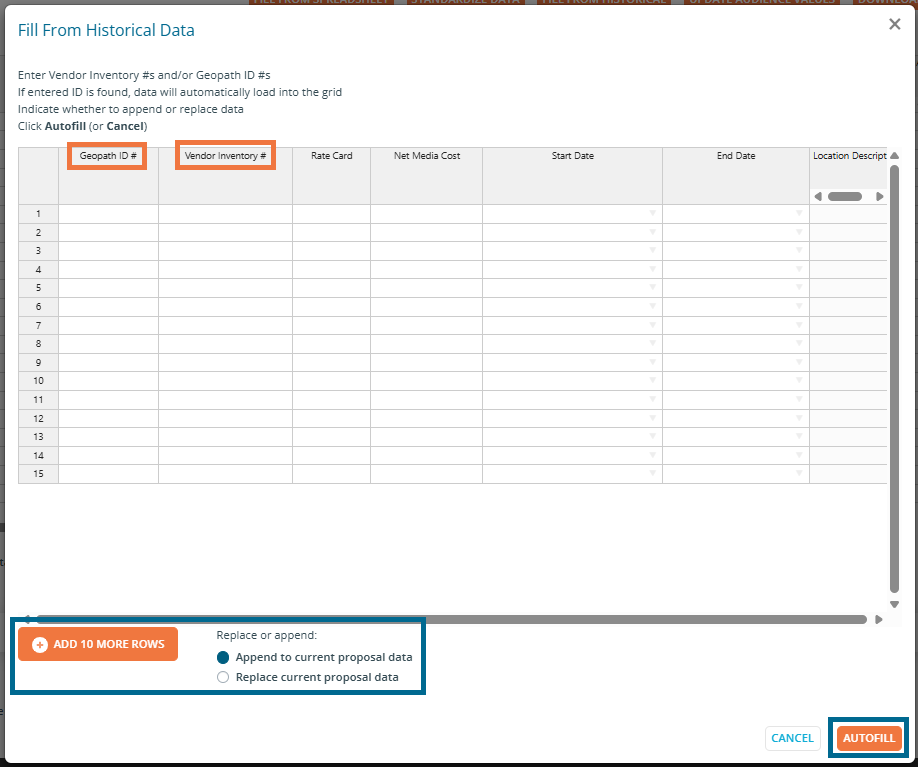 Once you have chosen to 'Fill From Historical Data', enter the Geopath ID # (COMMB ID for Canadian vendors) or Vendor Inventory # associated with your inventory. Start and End dates, as well as Rate Card / Cycle and Net Cost / Cycle can also be added under the appropriate columns. You can chose to either Append or Replace the data in the grid then click 'Autofill'.