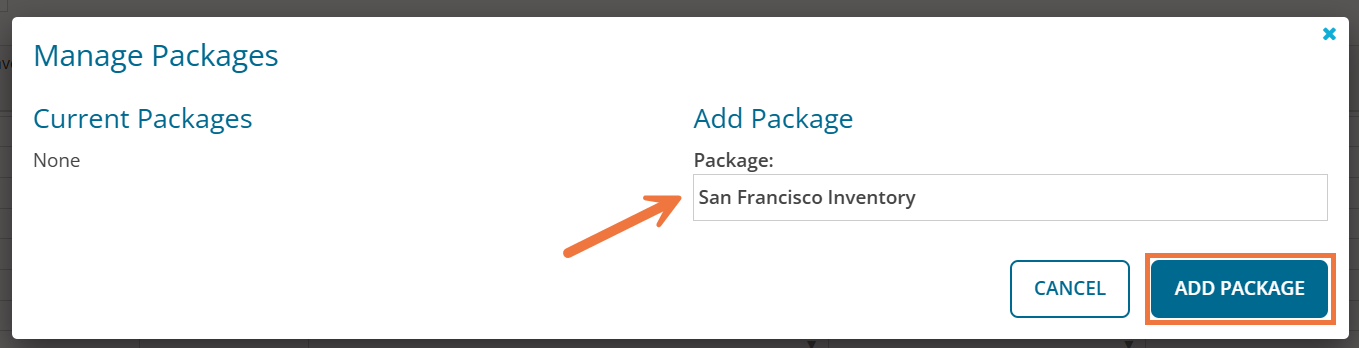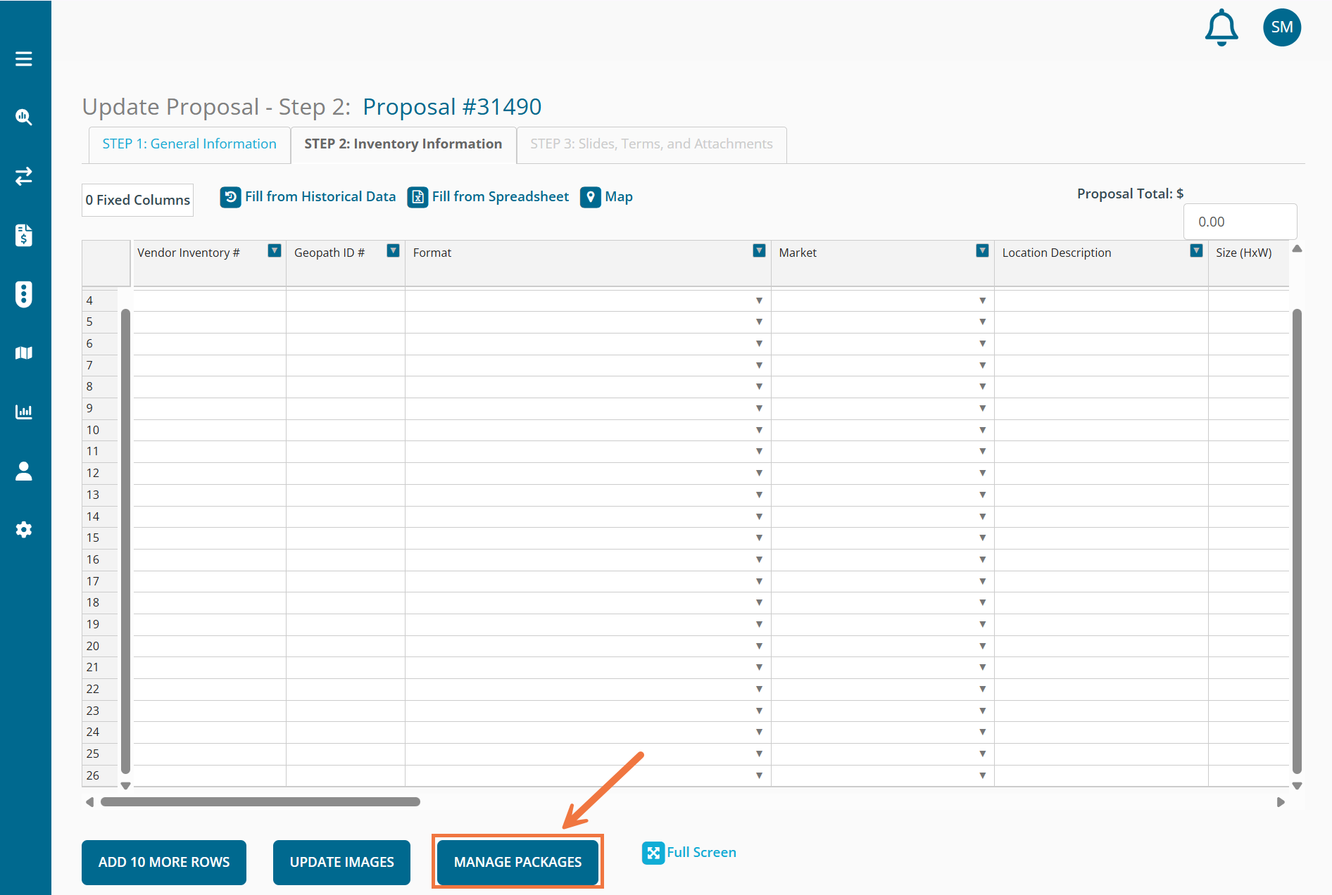 When either creating a new proposal or editing a previous one, once you arrive on Step 2 - Inventory Information, click Manage Packages below the inventory grid to add pre-made packages.