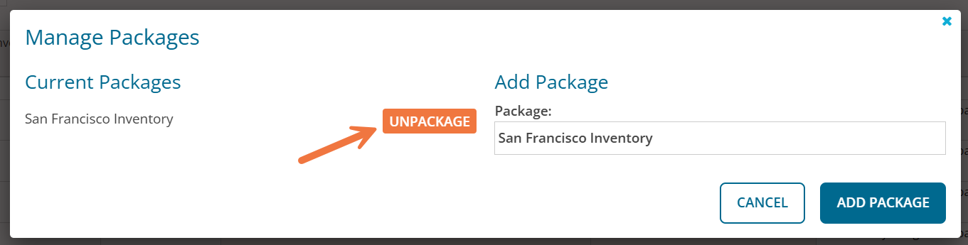 If you wish to remove units from a package, click Manage Packages below the inventory grid, and click Unpackage next to the appropriate package name. Note: You will not be able to remove single line items from a package using the 'unpackage' feature. All units will be removed from the package.