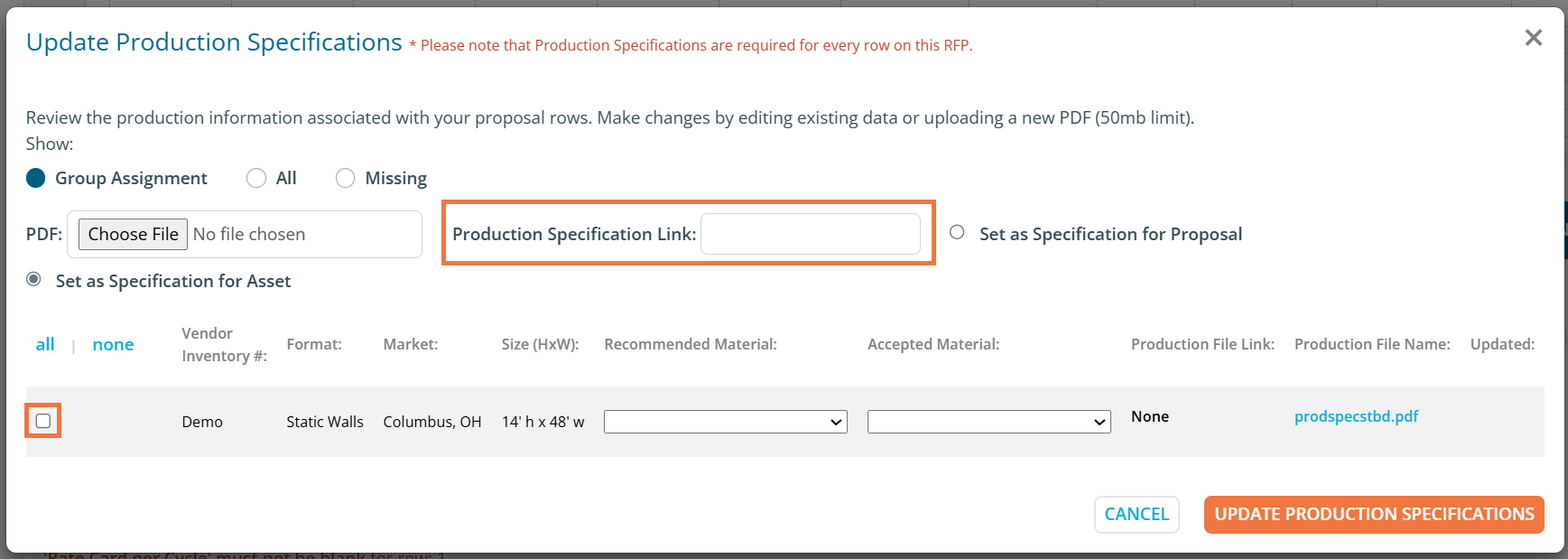 You can also add a live link to your production specifications instead of uploading a PDF file. You can do so by copying and pasting the link inside the "Production Specification Link" slot, and then selecting the assets you would like that link to be associated with: