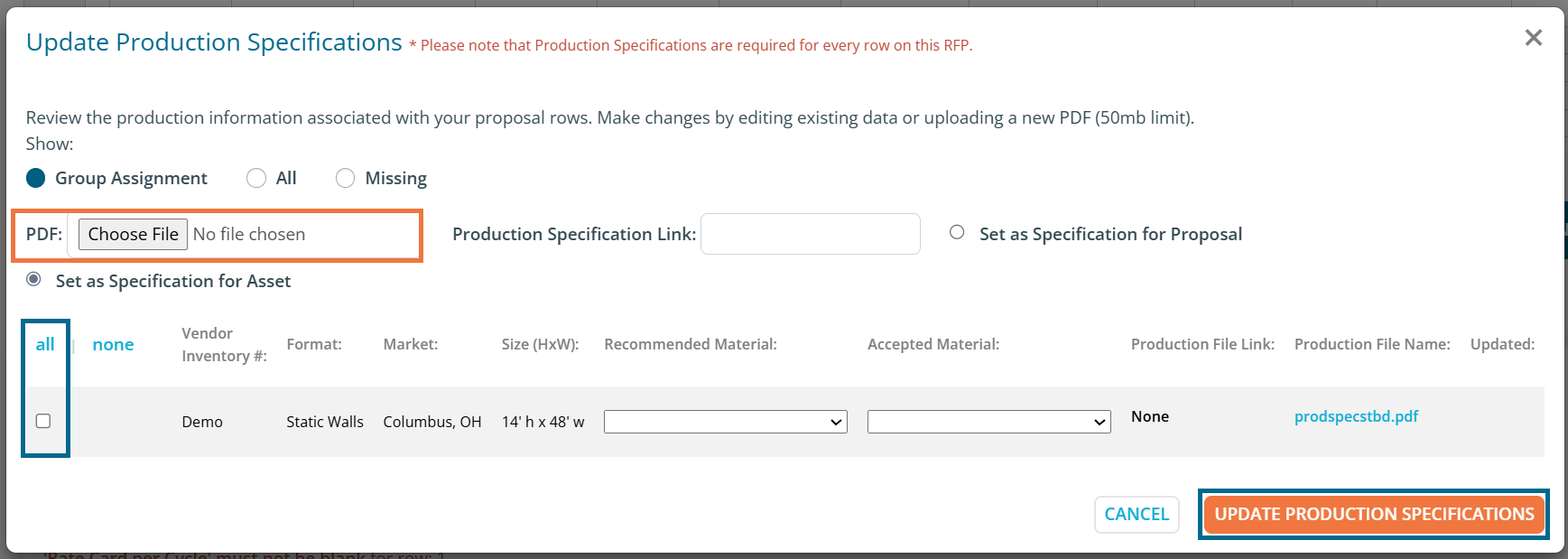 Tip: The "All" button (next to the "group assignment" button) will display all the inventory that you're proposing for the RFP. This is a great way to double check to make sure each inventory has a Production Spec. The "Missing" button will only display the inventory that is missing a Production Spec.