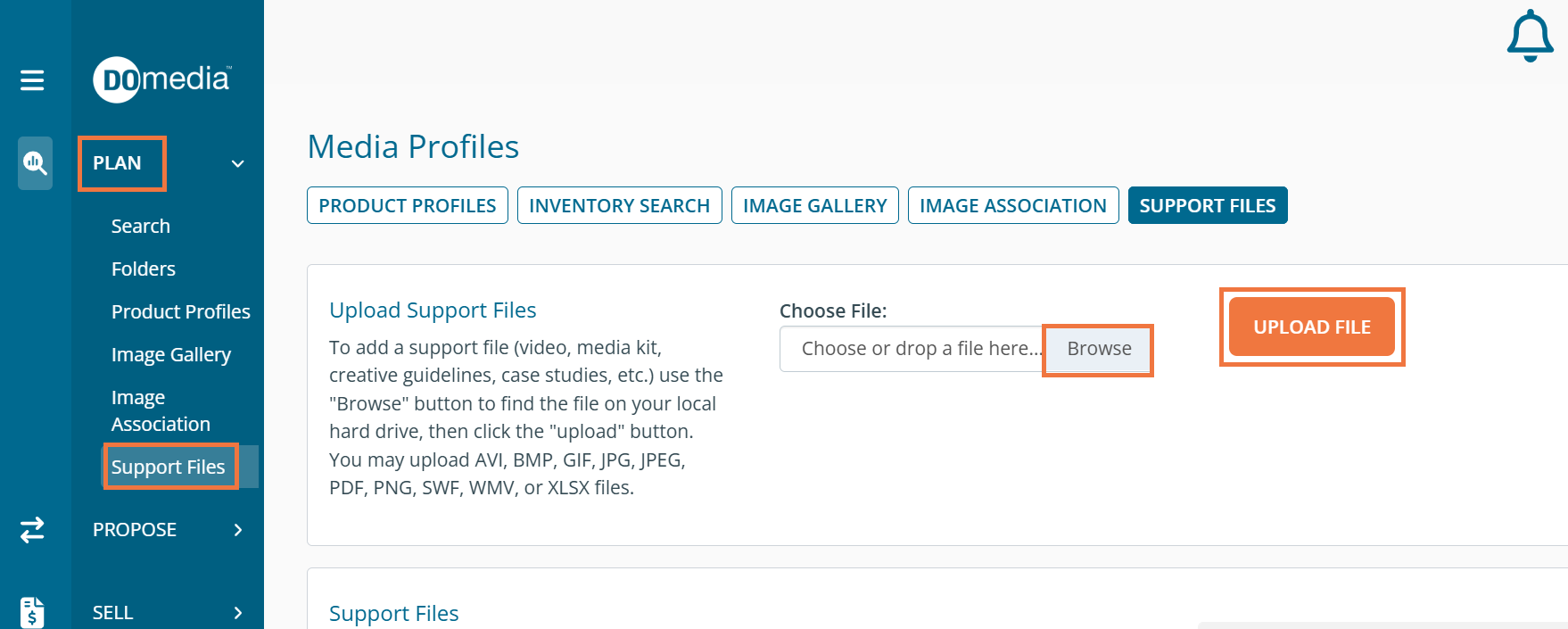 This feature allows you to always have the same Production Spec associated with an asset—which will then appear for all proposals that you create and answer in DOmedia. Go to "Plan" > "Support Files". Click the "Browse" button to select the prod spec sheet from your files that you would like to upload. Then click "upload file."