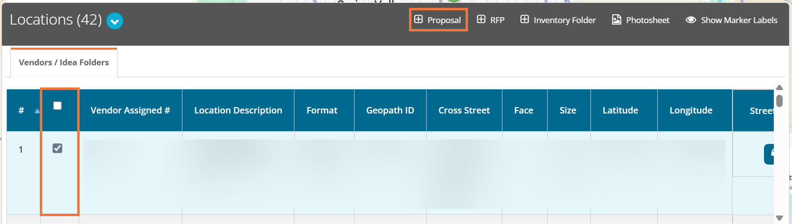 If you're ready to create a proposal from your map then you'll hit the map button under the action column on the map name you're working on. A map will appear on the next screen. On the bottom left, there is a box titled Locations with a blue arrow button. Hit that button and a drop-down grid will appear. Select vendor assigned #'s you would like on your proposal and hit the Proposal button.