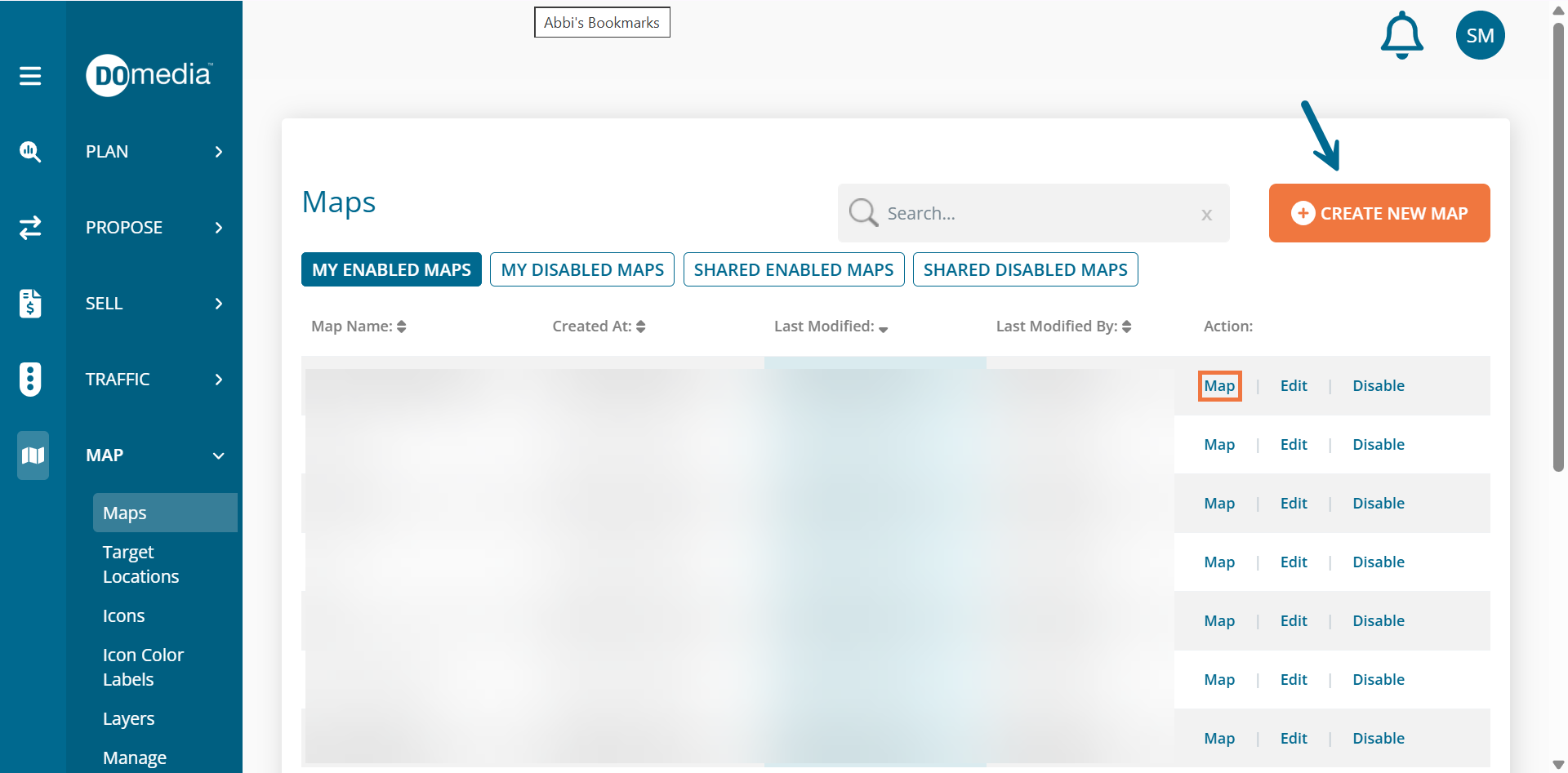 From this screen below, click Map under the actions column of the map name you want to create a proposal. If you want to create a new map hit Create New Map.