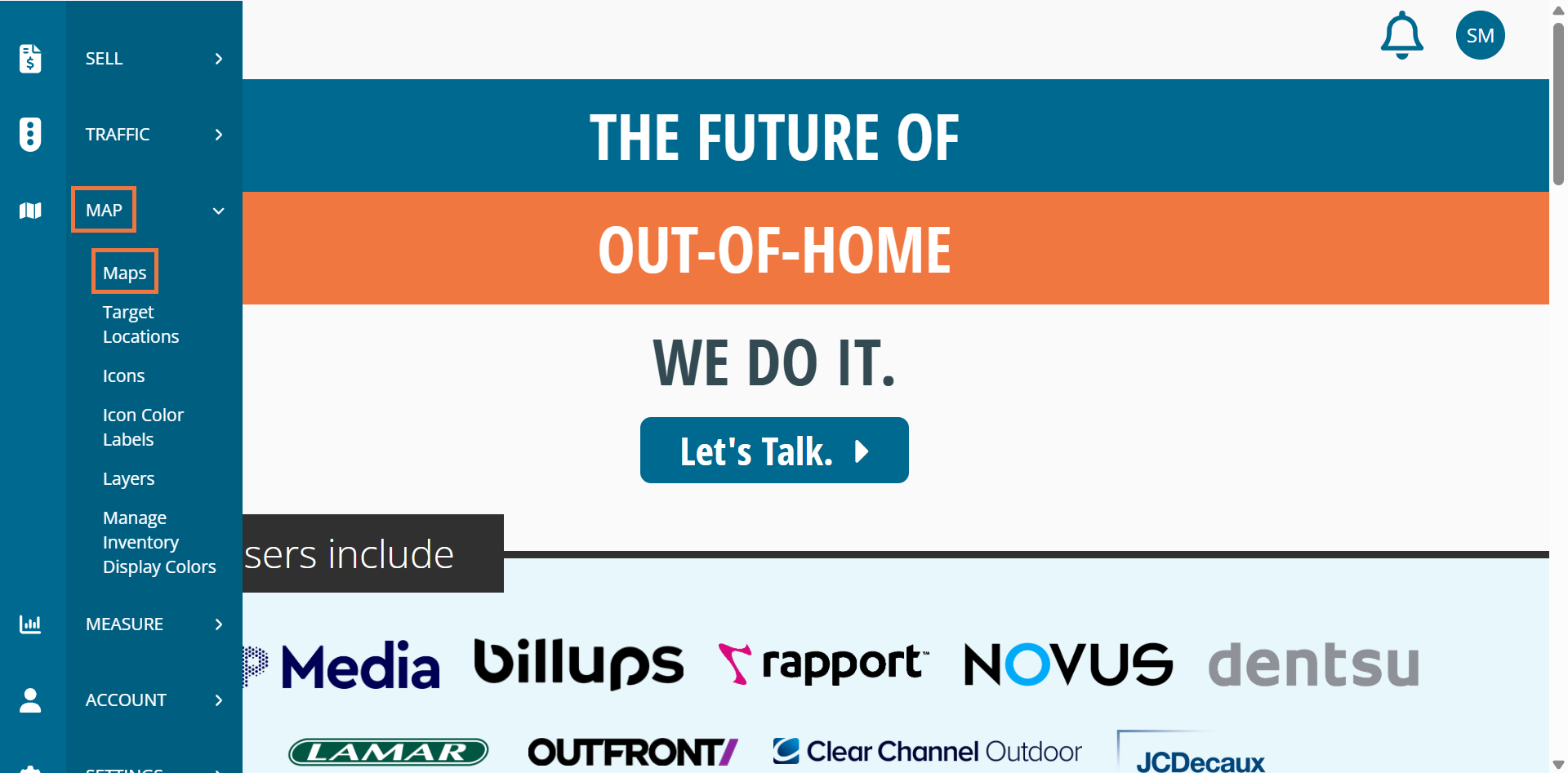 A unique way for you to create a proposal in DOmedia is through a map. Here you'll find steps on how to create a proposal from a map. Begin by logging into DOmedia and selecting Map then Maps on the left-hand side menu.