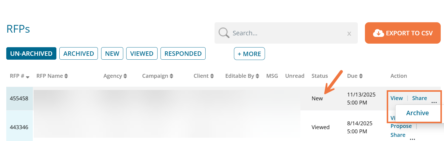Archive: Moves the RFP to an Archived dashboard (Note: Archiving an RFP will do so for