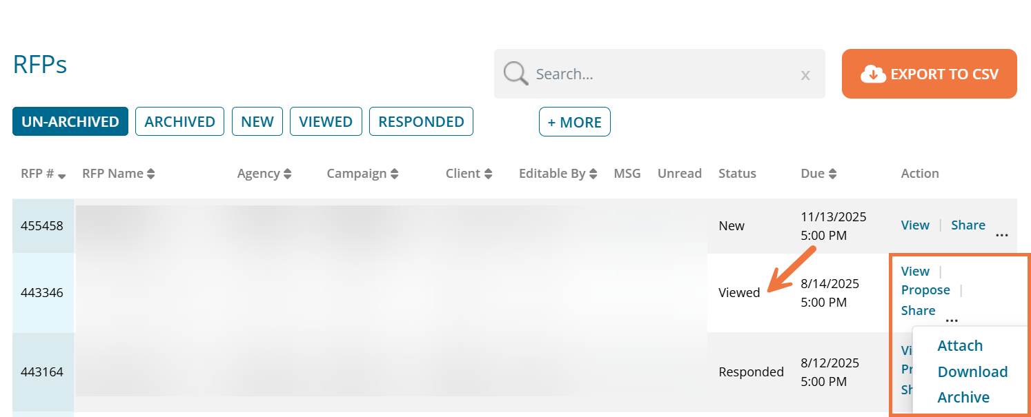Download: Download the RFP as an excel file and with all RFP attachments. Note: Actions can vary based on the RFP Status. Less actions will be available for RFPs in the 'New' status.