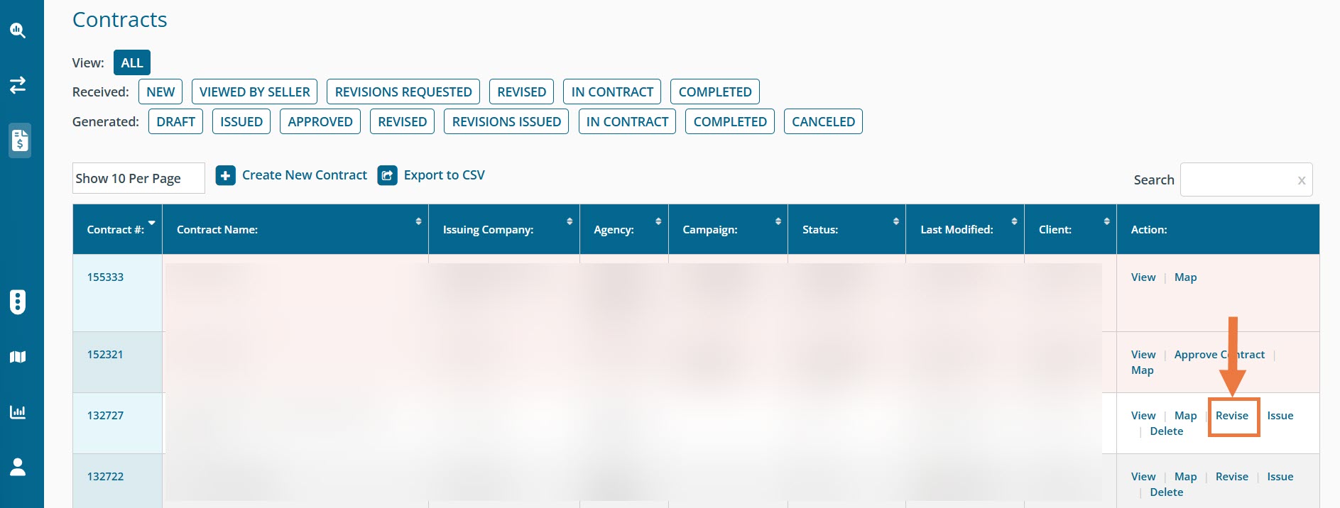 From the contract dashboard, search for the contract # you would like to revise. Once located, click "Revise" under Action.