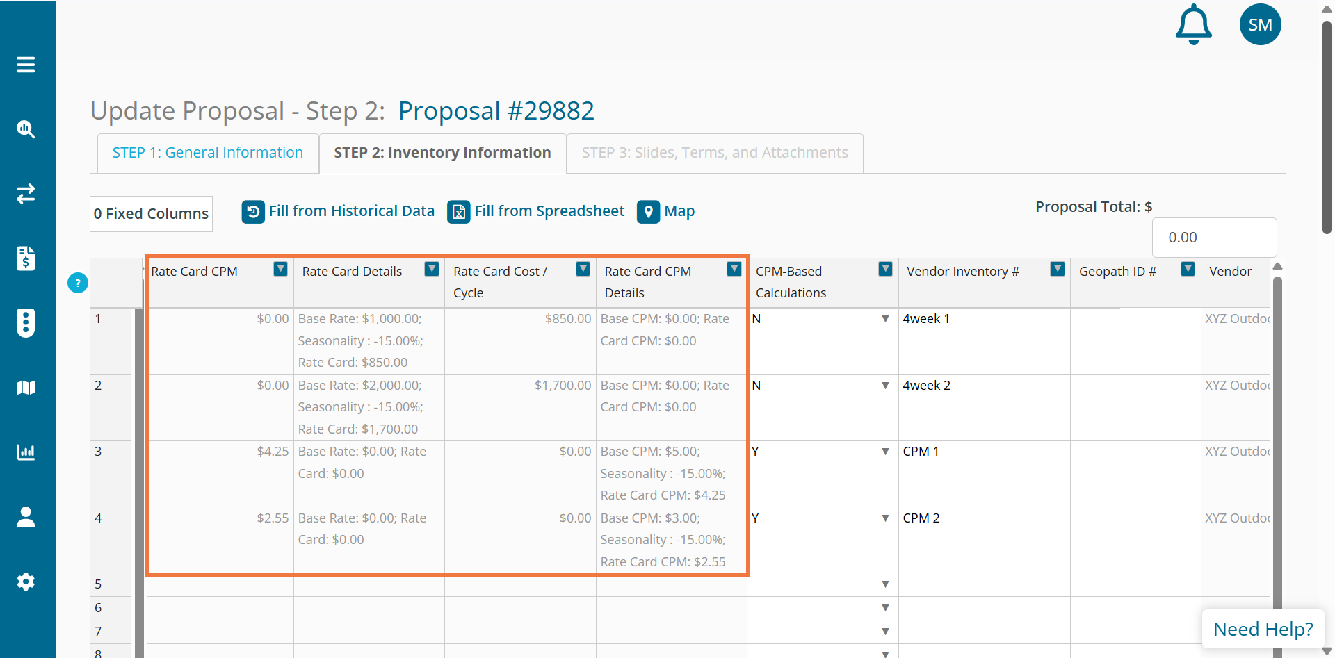 - The Rate Card CPM column will show the suggested CPM price for the media.