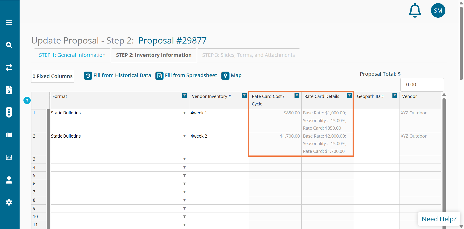 - The Rate Card Cost/Cycle column will show the suggested price for the media.