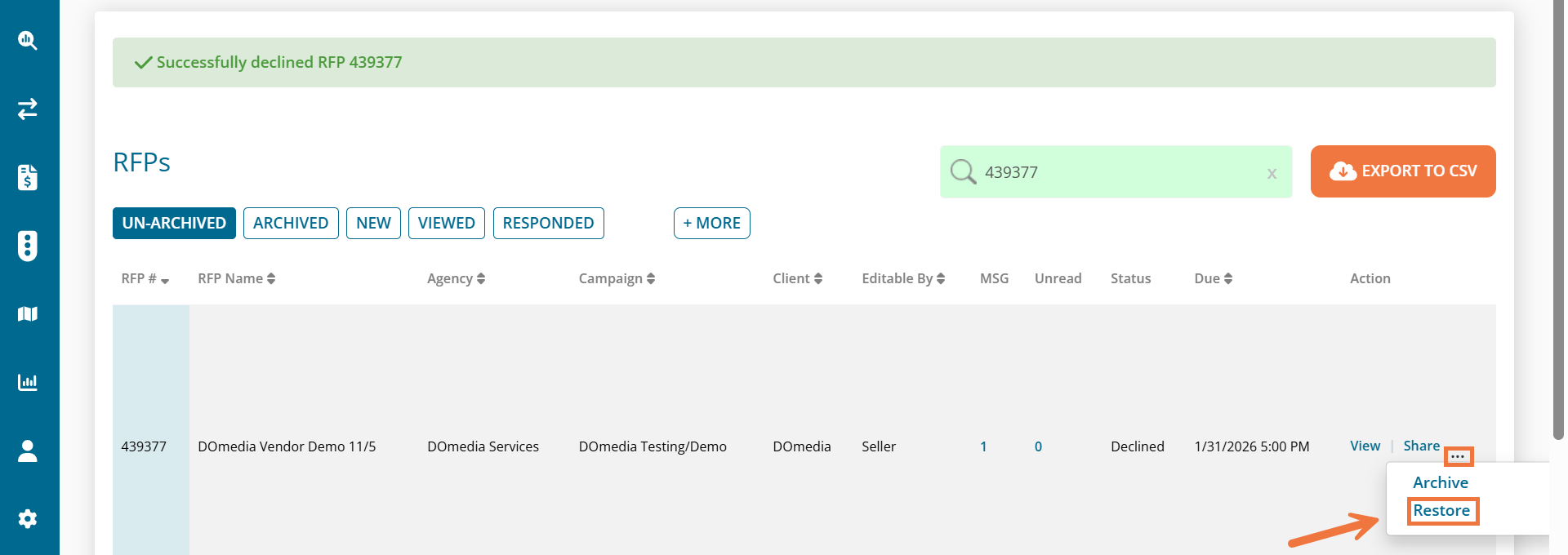 If you declined an RFP, but now need to submit a proposal for the RFP, you will be able to restore the RFP from the RFP dashboard by clicking the three dots and then Restore in the action column.