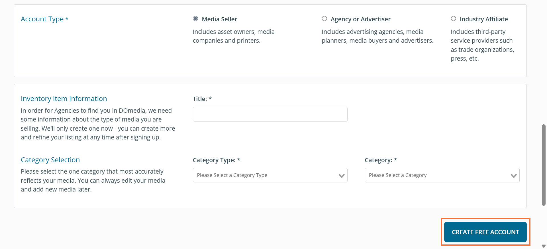 DOmedia will ask for basic information when you register for an account, such as company contact name, email address, and password for login; company name, phone number, and website URL; account type (Media Seller); inventory item information like title, category type, category, venue type, and venue; as well as to accept our Terms of Service.