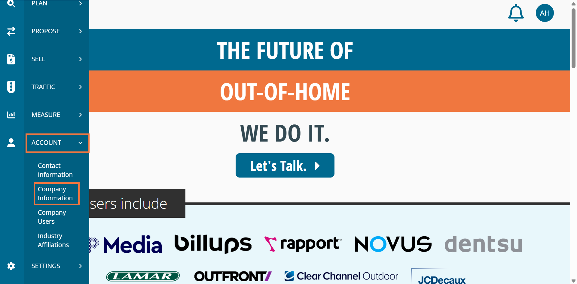 To access your Company Profile, hover over the 'Account' tab in the white navigation bar at the top of DOmedia's homepage and click 'Company Information' in the drop-down.