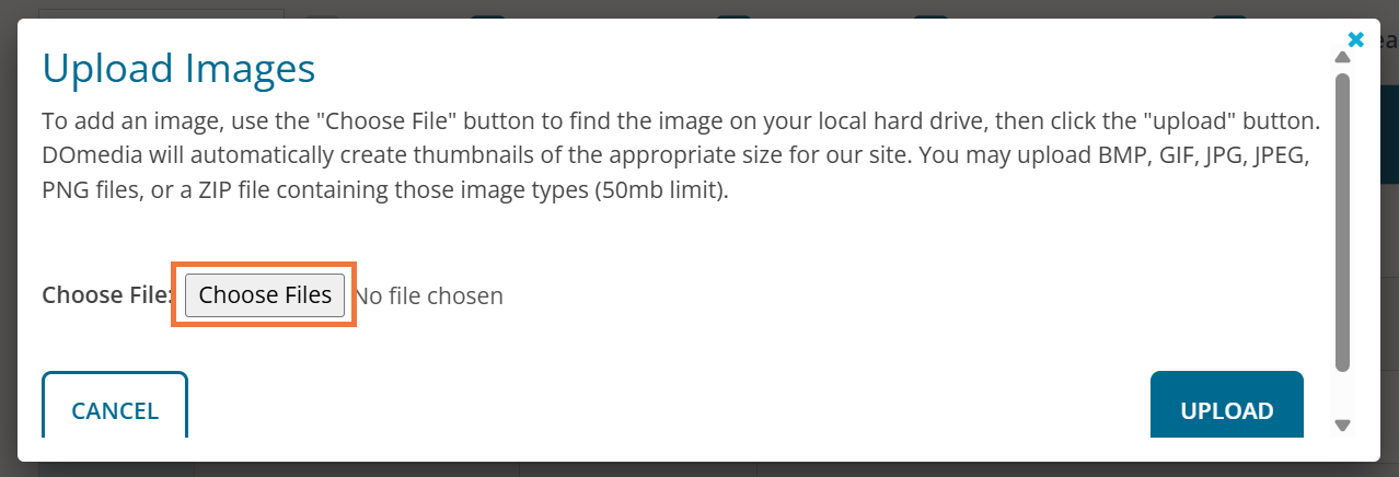 To add an image, use the 'Choose File' button to find the image on your local hard drive, then click 'Upload'. DOmedia will automatically create thumbnails of the appropriate size for our site. You may upload BMP, GIF, JPG, JPEG, PNG files, or a ZIP file containing those image types (50mb limit).