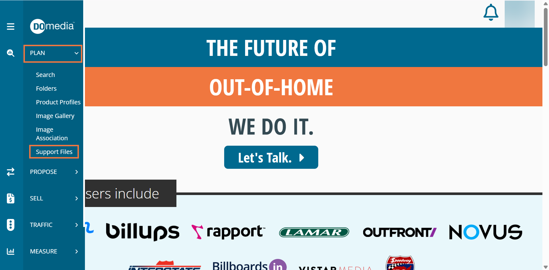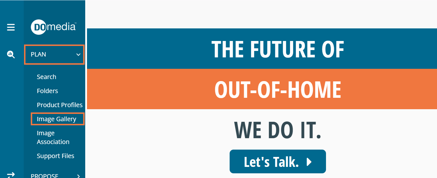 You can easily upload images into DOmedia that can later be associated with your inventory. To do so, navigate to the Image Gallery, accessed under the Plan in the menu tab on the left.